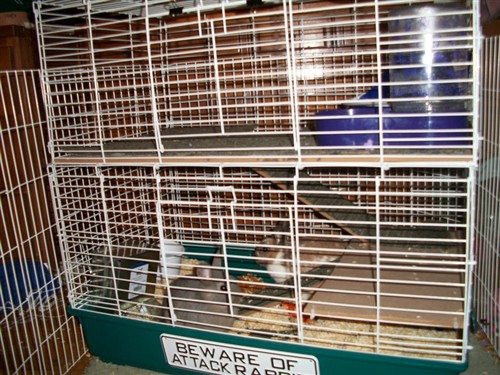 Oh, and here is a pic of the cage I built them since they were outgrowing their first one. It’s actually fully carpeted now and the litter box resides in the back left corner. Cutie is the tan & white broken. Maya is the gray one.