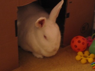 Mae is doing well! She doesnt hesitate as much now with taking things from me, I hand feed some of her salad and treats and hay. I think she will be a shy bun anyway, just trusting me. Some family came over for dinner last night and she wouldnt even greet them or take treats from them, they wanted to pet her but I wouldnt let them and I think Mae was grateful. So they dont really like her lol, she is boring for them. I tried to explain she was abused and still remembers it but they didnt think it should matter. Oh well, none of them will ever be bun sitters. She is very loudly chewing her cardboard box right now and its very annoying, turn up the ipod a little! She did let me pet her forehead last night, she freaked out a little after a minute but didnt spaz and run like crazy as before. Todays goal is the forehead and face. If it happens ill try her back tomorrow. But she is settling in, hopping around more freely and eating more regularly, dug at her blankets this morning.