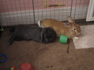 The new bunny abode. Hammer and Lucy left. Mae right, and her box is in the empty corner now.