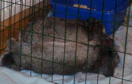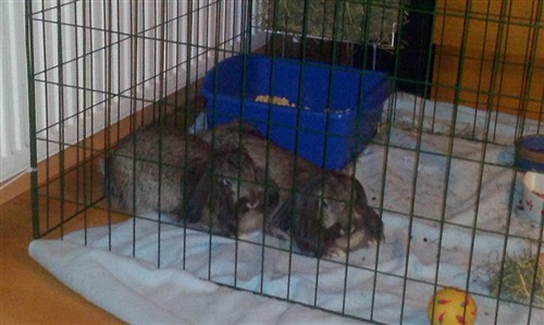 After some good hopping and cuddling… small cage, but they were ok for a couple of days (says the bunny slave who is feeling guilty).