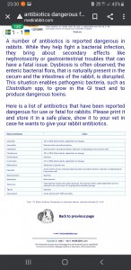 You can always search MediRabbit as a reliable place to identify what is OK and not for rabbits. Typically I’ll google Medirabbit and the medication name. From Medirabbit, metronidazole is another antibiotic.