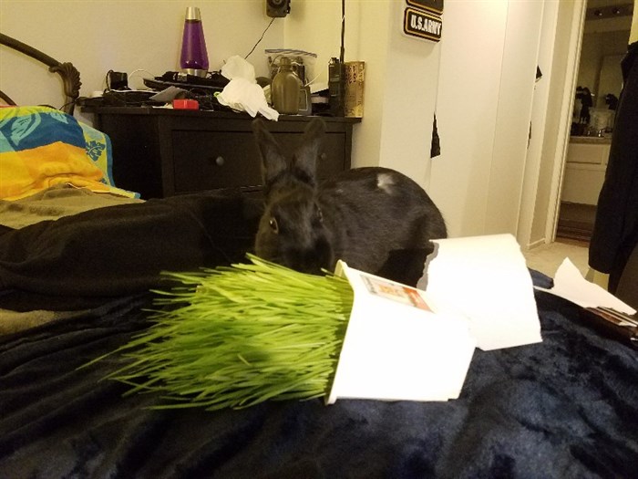 He also refuses as of late to hop on the bed or furniture completely, I checked his feet and no sore hocks or rubs and no smell of urine on fur. But he loves when i set him on the bed and he runs around and chews things like my duty belts (impossible to eat just likes to chew) Ive also just introduced him to wheat grass and he seems to really like it but still refuses to eat anything new like spring mix or herb mix. He will eat Kale by itself and he will eat basil, cilantro, mint but wont eat anything like green or red leaf lettuce, romaine or pretty much anything on the BB Aproved veggies list and being so few on the very LARGE list and i feel he might not be getting enough vegetables as I know Kale is high in vitamin A and can be bad if fed solely. Ive tried hand feeding, mixing it in with chopped bits, I simply cant get him to try new things and im worried that if all he eats is kale and a few select herbs ill upset his tummy. I get kinda jealous when i see bunnies eating huge romaine leafs and I want him to do that as well but I hold the leaf or place it down and he looks at it sniffs, and goes “Meh” and hops away. He will also not eat carrot tops, carrots in general, fresh strawberries or raspberries or any berry for that matter, Pineapple, apples (all kinds).