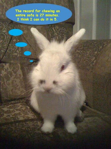 lol! I can’t stop laughing! Thanks for your advice RabbitPam. I am very lucky because he really only uses his toys to chew on. I am sure he can chew the sofa in five, I just hope he never does