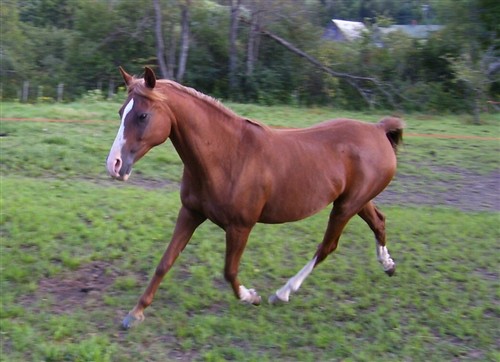 I have four horses – a palomino QH gelding, a sorrel Arabian mare, the overo Paint mare that was the original start of this thread, and an appaloosa gelding. I have pics of all but the Appy. My QH is pretty much just a buddy – he has navicular and has a hard time being ridden. Easy trail rides are okay, but ring work bothers his feet. My arabian is 16 years old and for the past couple summers I’ve been using her for gymkhanas (games on horseback, usually speed events with the objective to have the pattern run correctly with no faults at the fastest time) but after this summer she’ll be my trusty trail companion. Most arabians are skittish and high-strung but I’m pretty sure I got the one in a million that is not, because Lady is the most laid back, calm, and willing horse I’ve ever owned and I think you could shoot from her back and she wouldn’t care. This past weekend we carried the American flag in a parade at a horse show that i was at and the wind blew it in front of her face and she just stood there and waited for me to fix it. She probably would have kept walking if I asked her to. And the paint is really green under saddle right now, but she will be my boyfriend’s trail horse. Its actually really his horse, but i’ve been the one working with her all summer, so I’ve claimed her as mine until he’s the one doing the work!