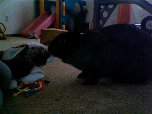 I like this time of year because there are lots of stuffed bunnies at the store- and it is a good time to buy a faux friend if your bunny needs one! I have a stuffed one I bought about 3 years ago- I slept with it for a week before giving it to Cotton so it would smell like me…awwwwww. But none of my 3 bunnies really pay much attention to it. We named it “hump bunny” because that is what I thought its role might be at some time or another- but nope- nobunny loves humpbunny.
