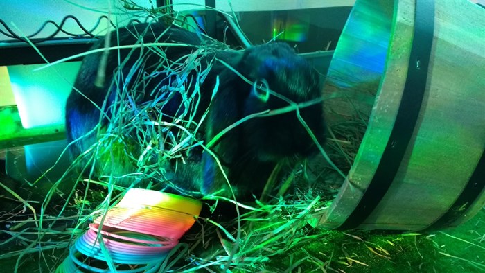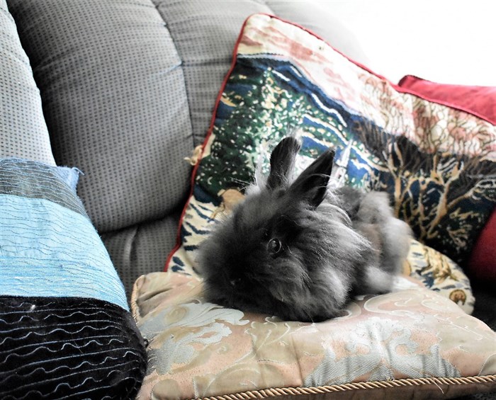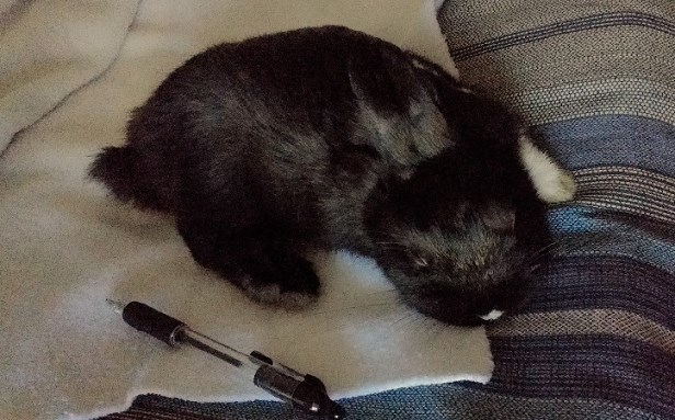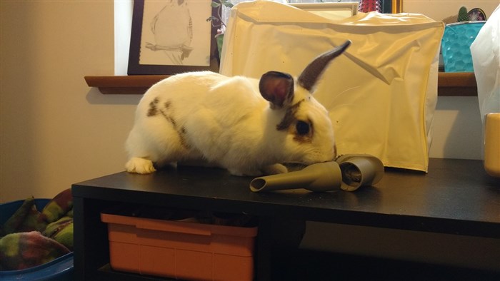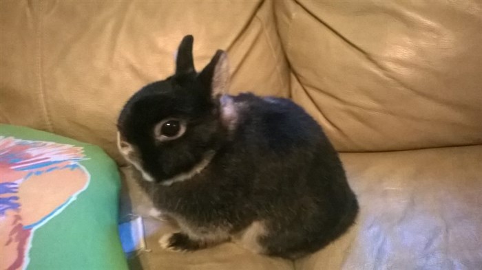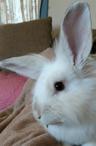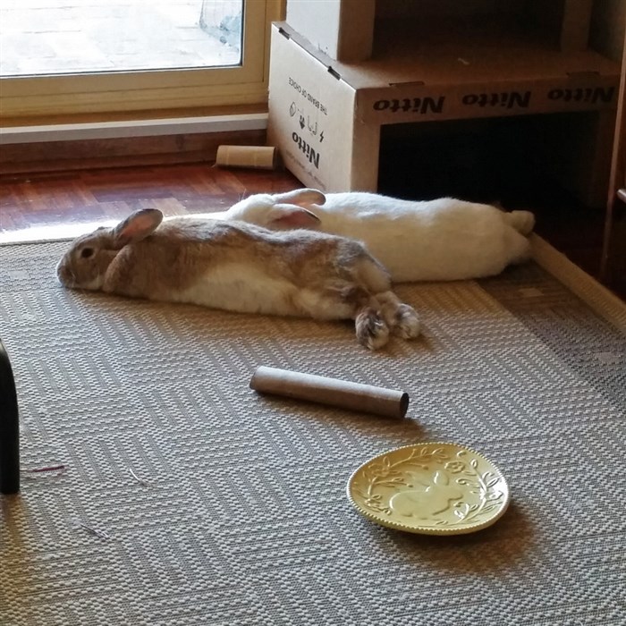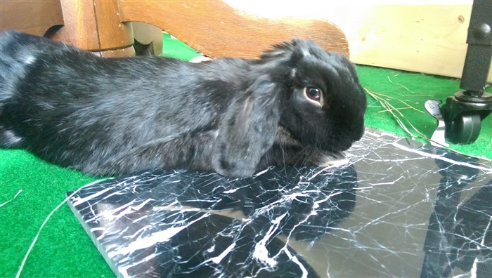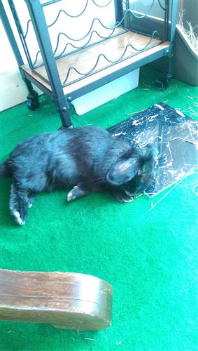 No, seriously, no idea – he’s adopted from the shelter in a country where baby buns are disposable toys for murderous toddlers. The only reason I know he’s part lionhead is because of his Beatles hairdo.