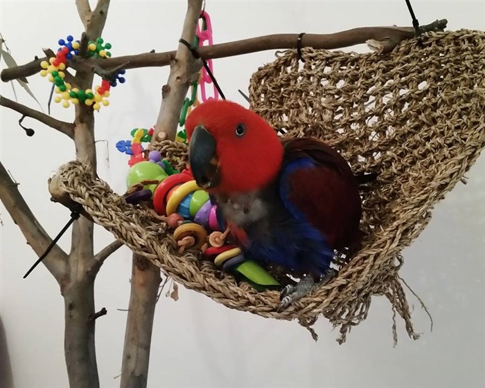 I redid her play stand a little, removed some of the finer branches which I think were in the way and added a bigger landing branch at the top. I then strung up a seagrass mat hammock for toys and treats. It seems a success so far. It’s nice to have her hanging out right next to me while I’m using the laptop. I’ve also been bribing her to stay there with treats and sprouts. It seems to be working