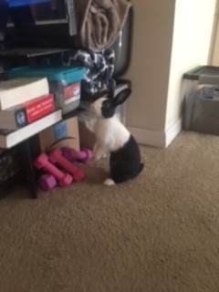 (Excuse my insane setup around the TV! I had to stuff every crevice with something to keep her from getting back there ![]()