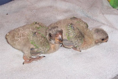 They are with Mom and Dad for now to get a good head start on life- but will later be taken out to be hand raised by me. They will not be tame and pets unless they are handfed and raised. Mom is doing a great job taking care of them- Dad seems to be doing OK but no where near as diligent as Mom is. This Tuku and Kirby’s second clutch- but it is the first clutch they have had while I have had them- and they are my first ever baby birds to raise (I have raised many baby mammals before).