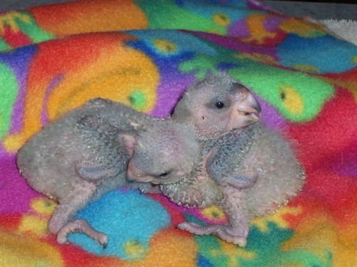 Here is a pic I took of the babies yesterday. I named them Muppet and Beaker. Muppet is older by 2 days and a little darker in color, Beaker is a little smaller and more vocal and caught onto handfeeding faster than Muppet. They are doing great though- I feed them 3-4 times a day- and even when their crops are bulging they still beg and cry for more food (It makes me feel bad having to stop, but I know that they are full). They cuddle into our hands, squeak and beg for food- they are very endearing.