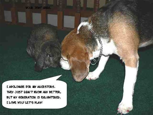 My main concern with bringing home a bunny, was my 6 year old Beagle, Odie. I’ve had him since he was 2 years old and he’s always been great with our cats and dogs, and even turtle. I’ve never known how he would do with Small Animals though, especially Rabbits, the animal his instincts tell him to hunt and kill. At our old house he was bringing me dead moles all the time that he had sniffed out in our backyard, hunted and killed. He is AKC registered and his mother AND father were used for rabbit hunting, and were reportedly VERY good. Obviously the instinct is within him. You can see, my concern was definitely a reasonable one.
