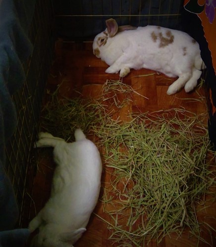 Now about 3 hours in, and both bunnies have eaten lots hay and both just mega-flopped at almost the same time. They are on opposite sides of the pen, but at least they feel relaxed enough to chill out. I was pretty worried for the first hour… and have been intervening with the vacuum sooner than I normally would just to make sure nothing escalates again.