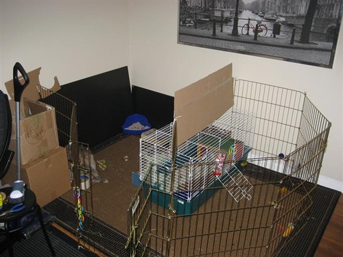 I know I just wish it wasnt outside…Lucikly we have blinsd up on our patio for now but with recent painting of our apartment buildings I have to bring them inside for like a week. We are trying a new cage/pen setup, now that its somewhat clean, and continue to do car rides and such. Hopefully that goes ok then I’ll move them back outside and really do the two week 24/7. Stupid painting is so inconvenient! hehe