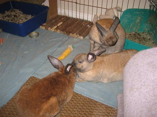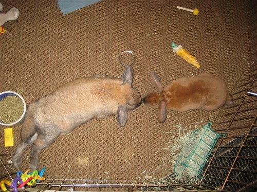 He is such a sweet bunny. He is a mini rex. Thats why we want it to work so bad cause all three cuddled up and triangle grooming…it makes me so happy to think of the possibilities and great pictures! I tried Davey and Dexter just a few minutes ago and it went ok. Davey seemed to be more nippy with him but the nipping also started once Dexter honked and tried to hump him and then went on from there…Davey did not approve. Davey asks for Dexter to groom him alot but Dexter refuses, he just wont lick him! So annoying cause then Davey gets frustrated and offended that he wont groom him and then gets nippy I think. I tried banana, and peanut butter…again nothing, but I did smear raisin goo all over Daveys nose and then Dexter finally licked him! But I had to put Dexters face right on the goo spot for him to notice. Dexter is very honky and humpy with them, Davey and Delilah dont really do the humpy thing anymore, on rare occasion, so I think they get annoyed with it.