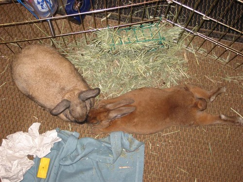 Ehh kind of, its all overnight though, no poops really during the day. Well Dexter and Delilah are in bunny love! hehe They cuddle and groom all day! I would have never saw it coming! On the other hand, Davey still doesnt like Dexter, but they will approach eachother and Davye shoves his head under Dexters, but he wont groom him. With Dex and Delilah though he seems to be in charge but she still tells him what she wants him to do and he does it whether it is a lick or a ‘move get out of my way!’. Still working on the boys!
