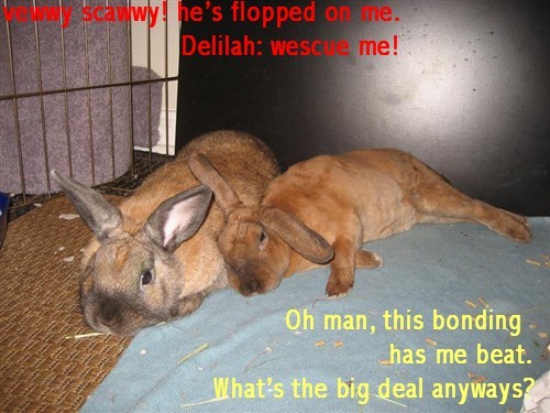 Yeah Davey and Dexter want to be buddies but Delilah just keeps pushing to hard. Sher sticks her little nose through the bars and nips at him so we are trying the spray bottle, but she doesnt seem to phased by it unless you get her really good. She is curious about him but just dosent want to give in so easily…I trimmed Dexters nails to day and he is the best nailtrimming bunny I have ever seen! He is already purring and flopping when we let him out.