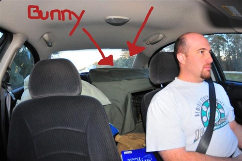 Some of you may ask why I drove my rabbit over 4,600 miles, in the past 7 weeks. I’ll tell you, so the families could meet their ‘grand-bunny’, which THEY have dubbed him. From Thanksgiving Day to Jan 10, (with 10 days break at home) we spent traveling across the country, in a dodge stratus. Tight conditions for 2 adults, a bunny, and xmas gifts.