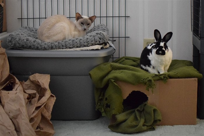 Obviously, you’ll want to make sure there is no predator/prey instinct in the cat around the bunny. Make sure that the cat is not “stalking” bun or swatting at him