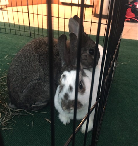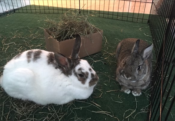 They both did multiple flops, but mainly on opposite sides of the area. Lots of grooming themselves and eating hay. I attached some photos from the date. At one point Leo was eating hay about a foot away from Gibbs and Gibbs was kind of frozen, but after a minute Gibbs got a little closer to the hay and started eating right across from Leo! Seems like this space works well and the buns seemed less stressed than they were outside in the grass.