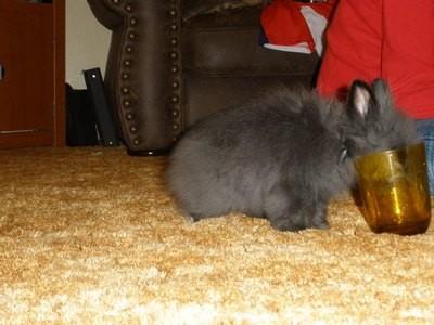 I don’t have a picture but a few days ago I put one of my dogs crates next to my newest aquarium with my big Blood Parrot Cichlid in it. Pacey has always been fascinated with this fish for some reason and will just stare at him for hours. I left him out to play while I did some cleaning. When I came back in the room there was my little fluffy black bunny soaking wet sitting on top of the fish tank pawing at the big orange fish like a cat. As soon as he saw me he hopped down and ran under the cabinet.