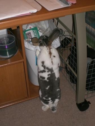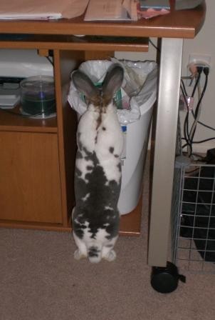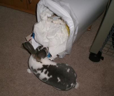 The picture of him looking into the garbage can, he has such a cute bunny bummie!