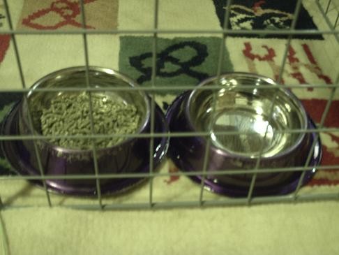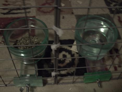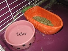 She hasn’t had water from a bottle since I brought her home. She’s never had too much of a problem keeping her water clean. (Except that week where every time I gave her clean water she’d go get a piece of poo to put in it.) She’s going to have to learn though if she keeps up this attitude problem. BTW, since I borrowed a camera this is a pic of the bowls that were not supposed to be able to be tipped.