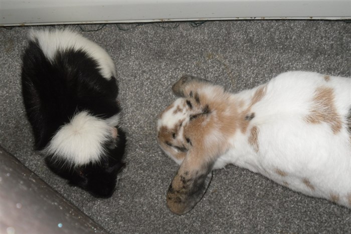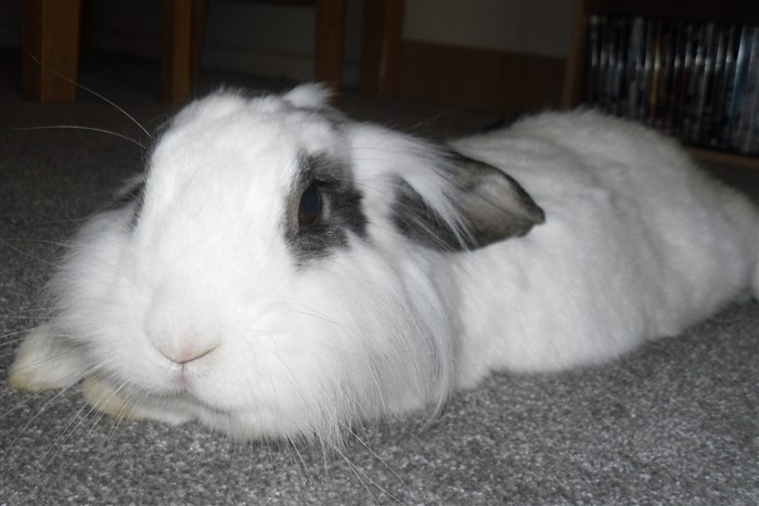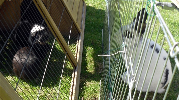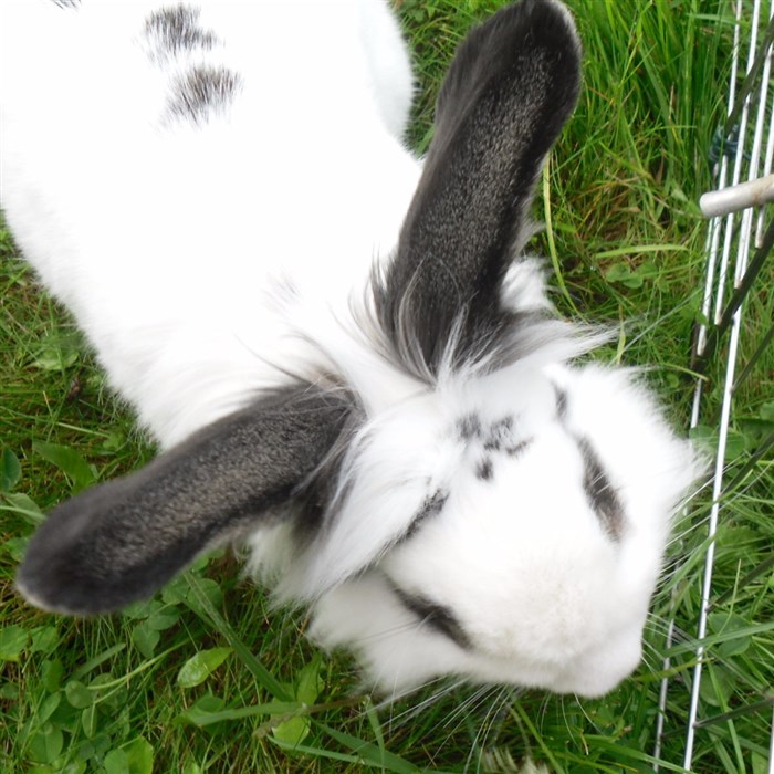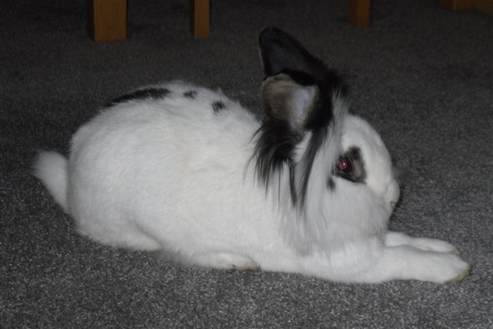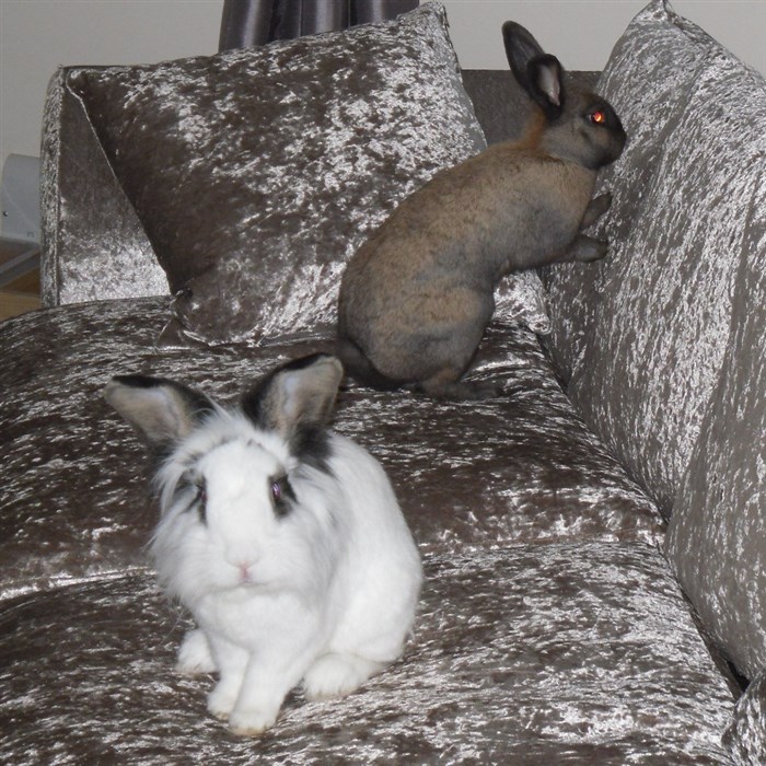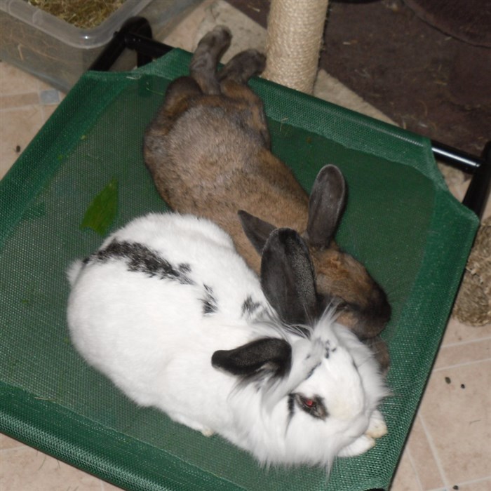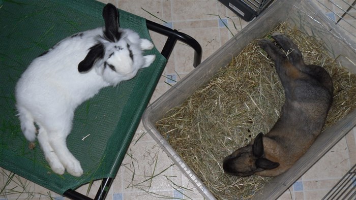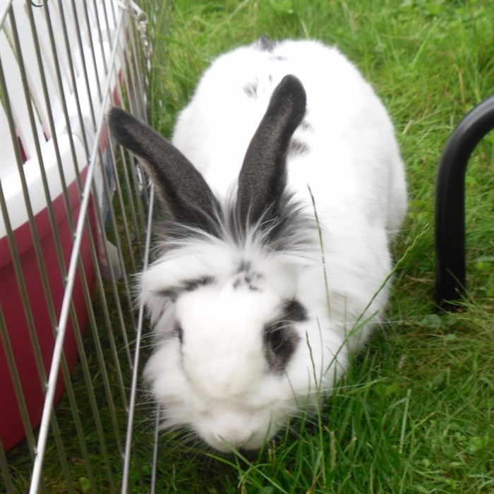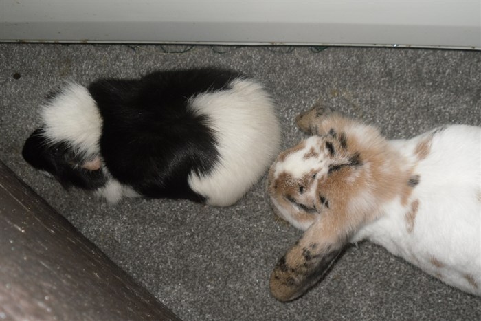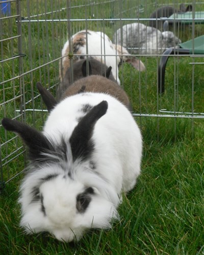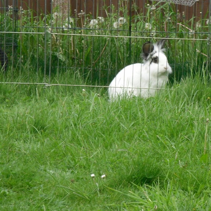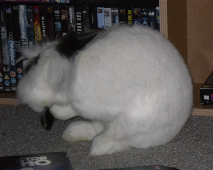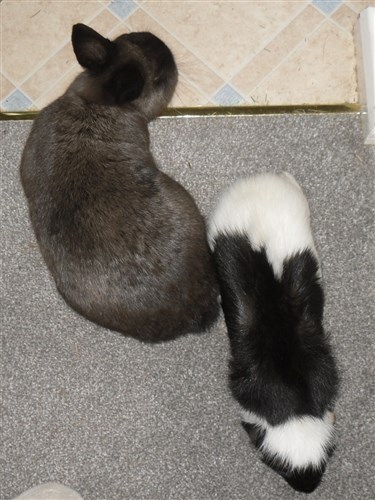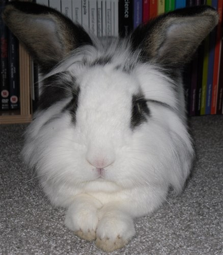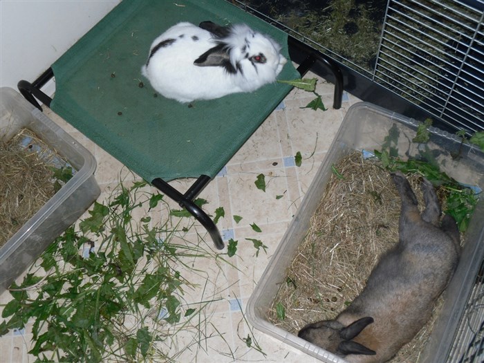 Podge was a stray and was adopted by us just over three weeks ago, as a boyfriend for another stray we adopted. He’d been stuck in a rescue’s hutch since last summer, and so is behaving more like a kit than an adult, always on the go, and everything is a great adventure! Podge and Gina are now in the process of being bonded with another pair, who includes our third adopted stray.
