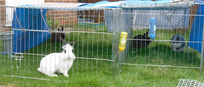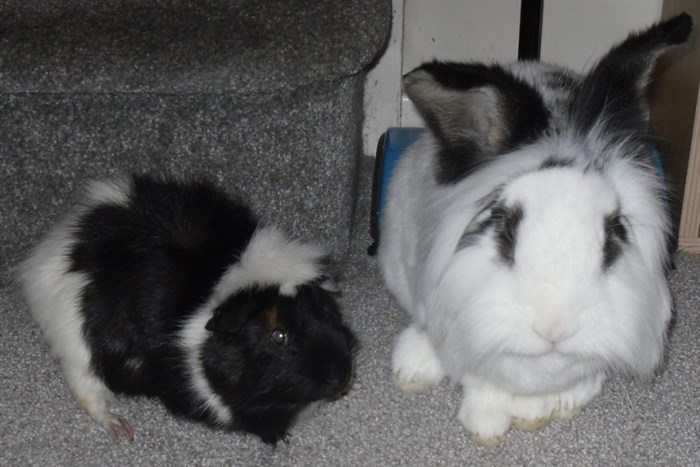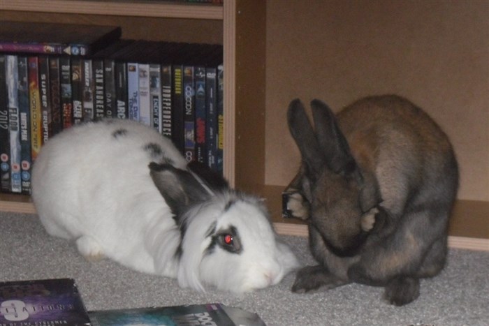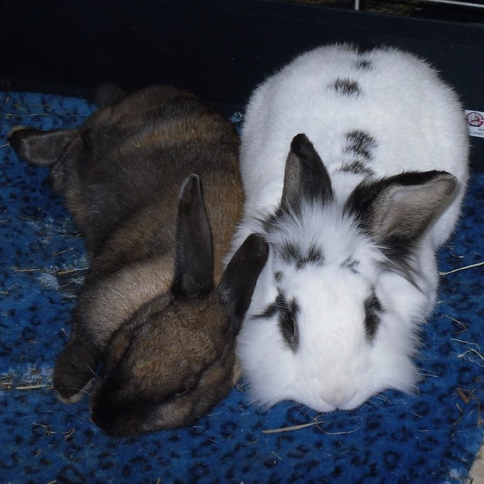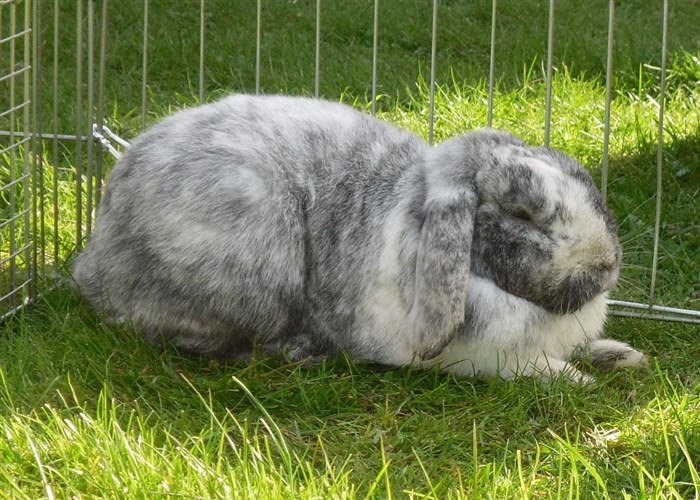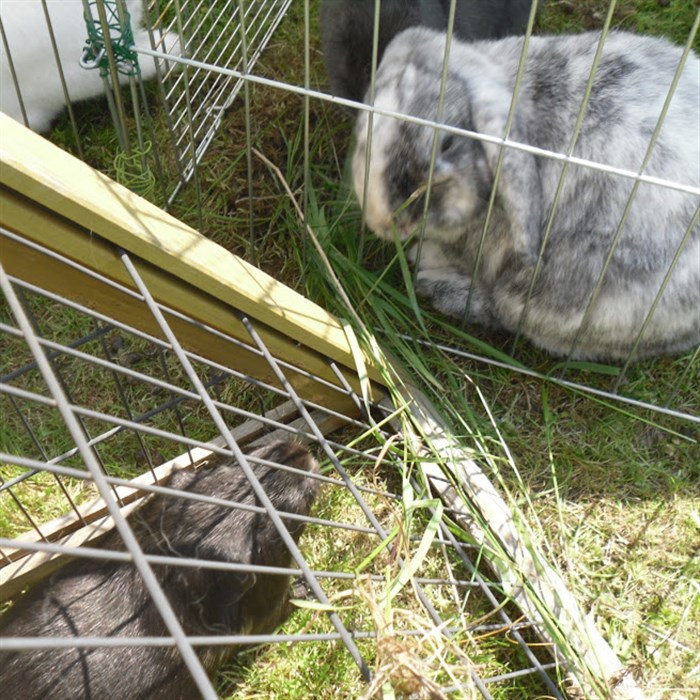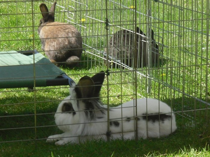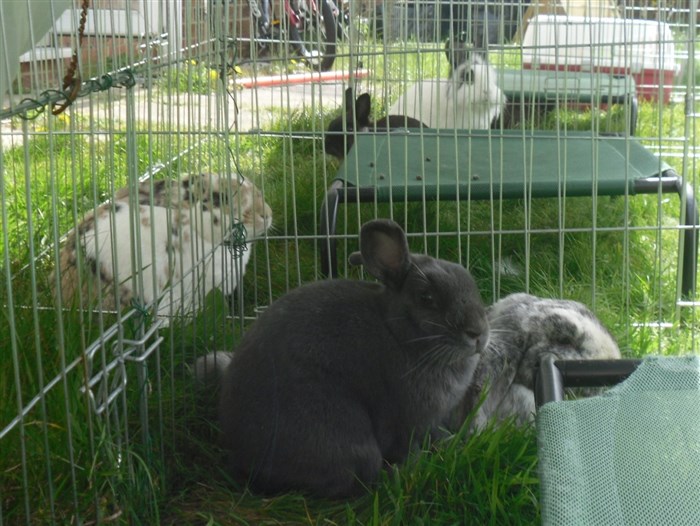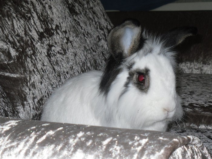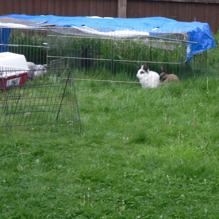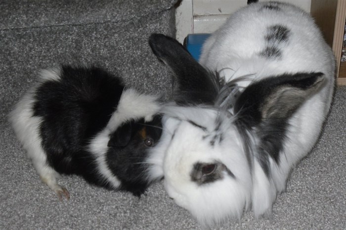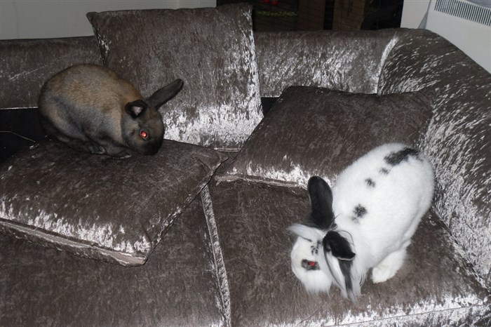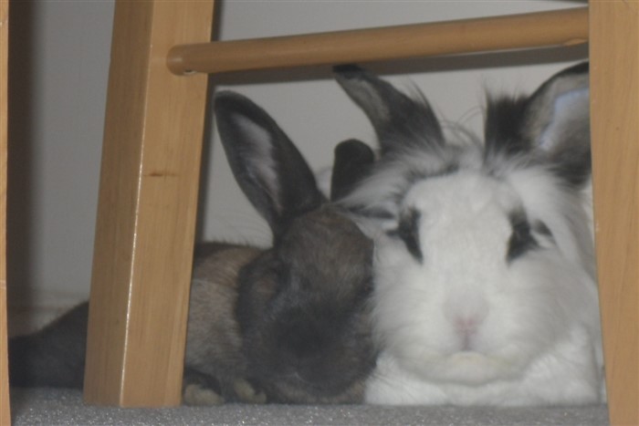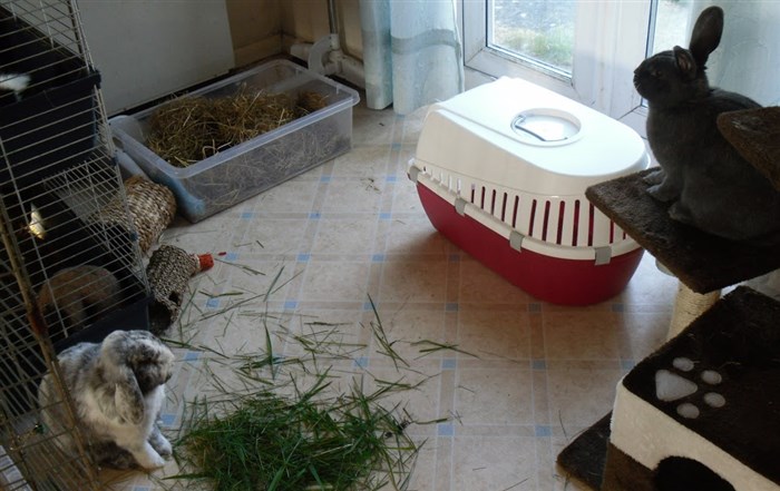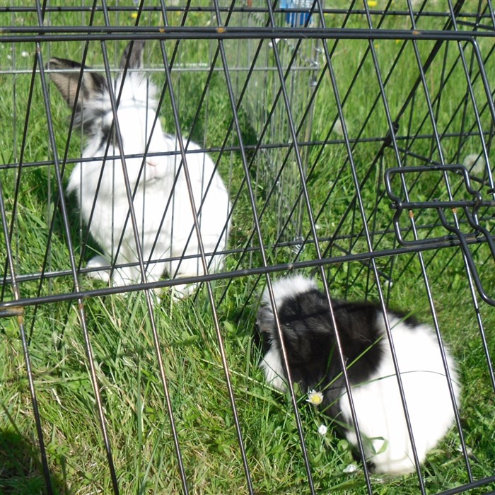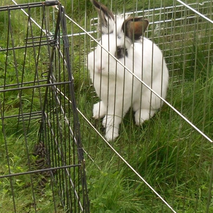 Podge was a stray and was adopted by us just over three weeks ago, as a boyfriend for another stray we adopted. He’d been stuck in a rescue’s hutch since last summer, and so is behaving more like a kit than an adult, always on the go, and everything is a great adventure! Podge and Gina are now in the process of being bonded with another pair, who includes our third adopted stray.