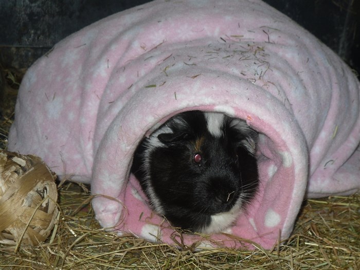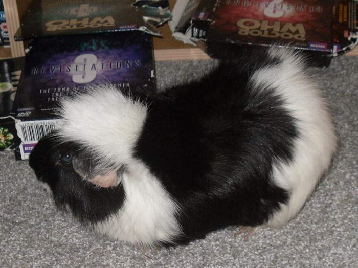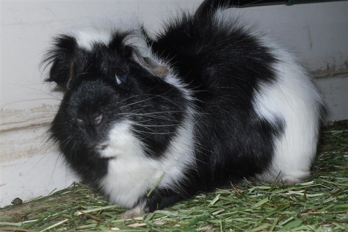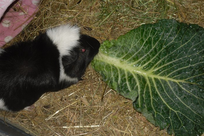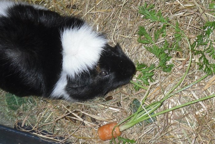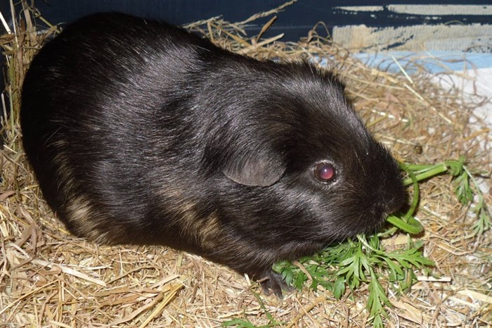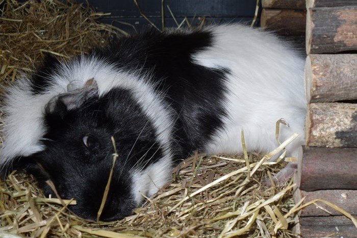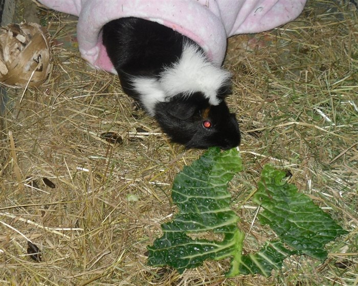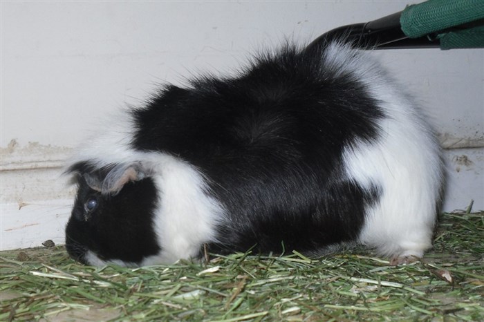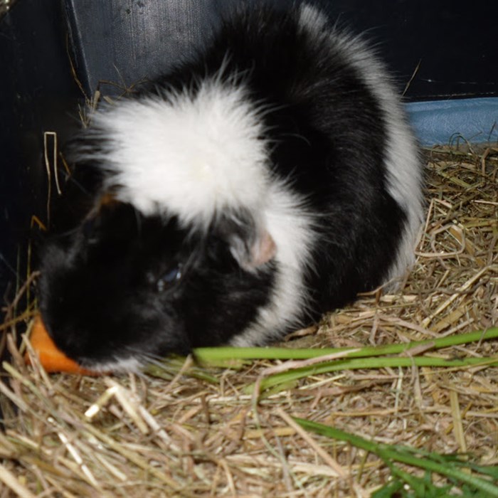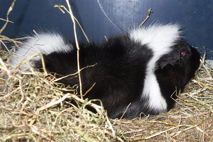 The Guinea pig has a bit of brown next to its eye!