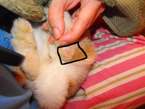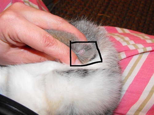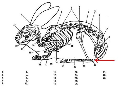 No – think more Bun in full stretch out with feet kicked behind her – the spot where the leg bone and foot bone convene. It almost looks like an ankle(?) if I were to draw a human to rabbit comparison.