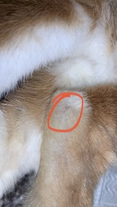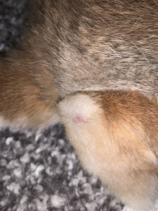 We’ve covered our floor with thick soft blankets now, and we put ointment on his hocks. It’s healing but it takes a long time for the fur to grow back over it.