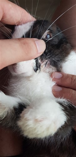I think I’d trim back the clumped hair just a little bit, taking great care not to hurt the skin. Then I’d put on a fat barrier cream for protection and try to teach him to drink from a bottle. Sometimes that can be achieved by smearing some banana onto the bottle nozzle.
