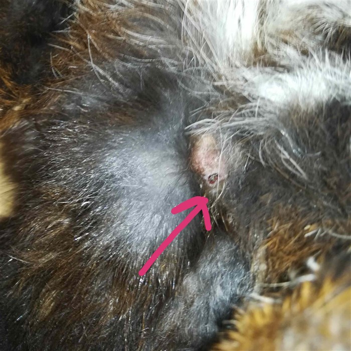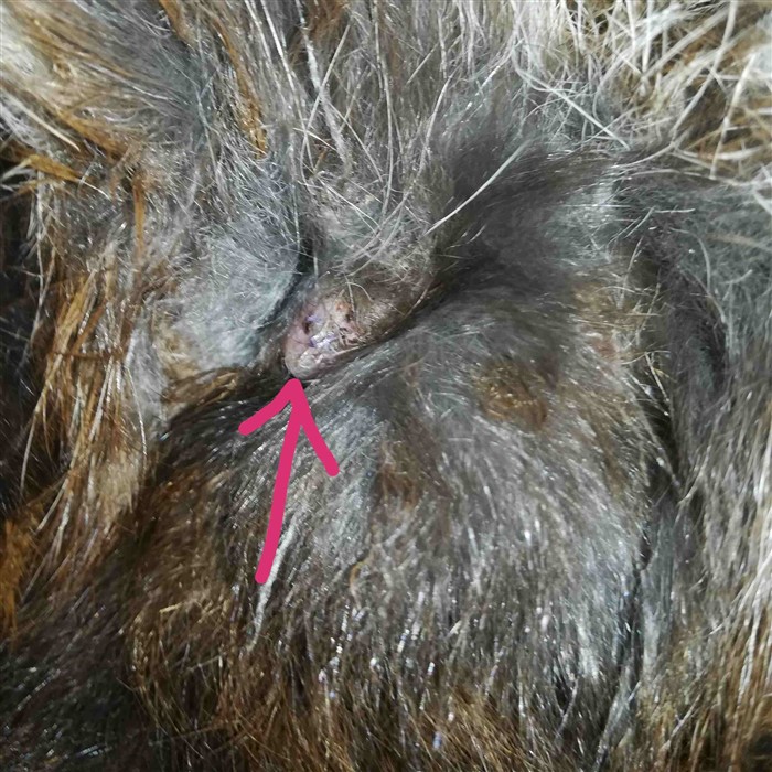 It’s really hard to tell from the pictures. Is the sore in the second picture scab like or does it look more like an ulceration? It almost looks like it has hair stuck in it and needs cleaned. Does it have a bad smell or any discharge from it?