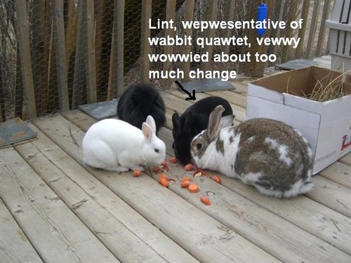 Ok, I will explain to be polite. My name is Lint and I am a wabbit wepwesenting my wabbit quawtet. Wabbitpam has helped us in de past, when my slave wanted to twade us for anothew wabbit on hewe; she wanted to send us away to get diz othew wabbit in place of us! At least, she said so. The othew wabbit was vewwy beautiful and she wants him but she has enuf wabbits alweady. Wabbitpam spoke on our behalf. Wabbitpam is our fwiend.