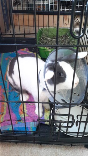 Sticker bunny she is in a dog crate. And she has internal stitches with the surgical glue on the outside. She’s just been ready to go from then get go. Like, I opened the crate after getting back and she hopped right out and tried getting out of her cage to explore lol! I feel so bad for her with this cone on. She’s 4 days post op tomorrow and she still has this cone! Her incision doesn’t look good enough for me to feel comfortable allowing her to groom it as much as she was when I took it off. I wonder when the skin is healed enough for it to withstand the licking? Im sure it’s just itching because it’s healing