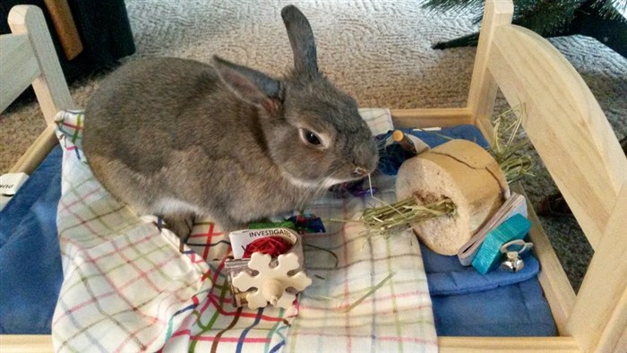 The boys were not amused by my attempt to play Santa. I wrapped a willow ring, placed it in the middle of the bunny room and walked away. A few seconds later, I heard rustling. I peeked through the door and Leopold was throwing the package across the room. He could smell the willow ring, but couldn’t figure out why it was wrapped in paper. Wooly just sat watching with a bewildered look as Leopold continued to throw the package around. LOL