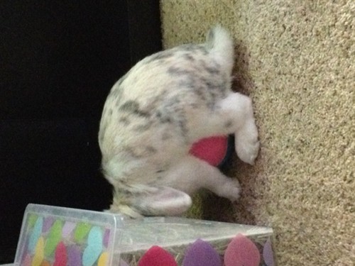 Sorry the pictures are crooked – I’m not sure why. But I hope you all get a laugh. She refused to bond with another rabbit but has fallen head-over-heels for an inanimate object. Oy vey.