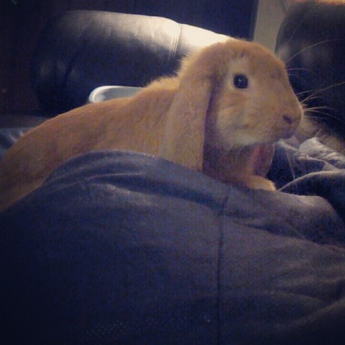 oh! And I finally saw my boyfriend’s brother’s rabbit, Blue, for the first time since becoming a rabbit owner. She’s so tiny compared to Finn! She’s adorable though, but very territorial. You can’t sit on the couch if she’s on it or she’ll dig and bite you. She loves getting nose pets, and Eric (brother) can pick her up and smoosh her and rub her all over his face and she’s perfectly happy.