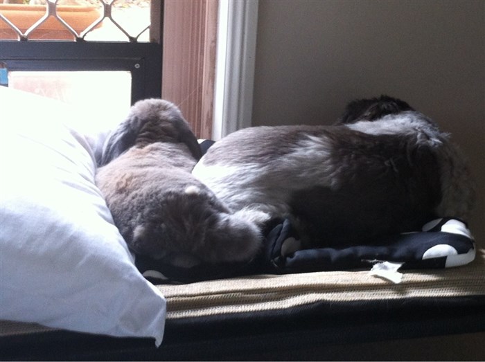 AH — with mine, somebunny is usually squeezing between the wall and another flopped bunny. Henry is definitely the first I’ve seen squeeze between a pillow and a dog butt! Does look pretty cozy!