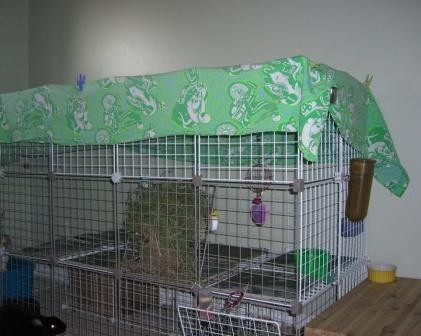 My vet told me a while back that I should never cover my rabbit’s cage with a blanket or sheet. I don’t remember why… maybe it had to do with air flow or something. Anyway, I don’t know if that’s correct, but I figured I’d pass it along, just in case.