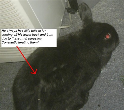 Poor little Mischi also seems prone to parasite infection…moreso than my two cats or other rabbit. Even with the treatments I provide (revolution, advantage—drops) he has to be regularly brought to the vet for treatment such as Ivermectin injections.