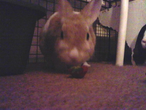 So I went to the farmer’s market yesterday and picked up a couple of different things I thought the buns might like.  First try is the strawberries.  Maryann couldn’t care less while Dono seemed to try and figure out what this strange, yummy thing was and how to eat it.  I only got a couple of pictures because he’s so scared of me but still any pics of buns are good pics (speaking of which, it was dark and I was using my camera phone so excuse the quality).