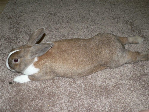 She is a Netherland Dwarf, 3 pounds. She is not overweight, just a false dwarf – no present dwarf characteristics. She LOVES to FLOP, blankets, and will sit and sit and sit and wait to be petted