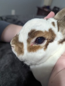 Azerane is correct – that pinkish stuff is actually the eye discharge. The fact that it was pink was what worried me the most initially, since my buns do get the occasional eye boogers like people do. But I’ve never seen eye discharge like that. He did end up going to an emergency vet on Saturday and he’s currently taking 3 meds to help with an infection and irritation of his eye.