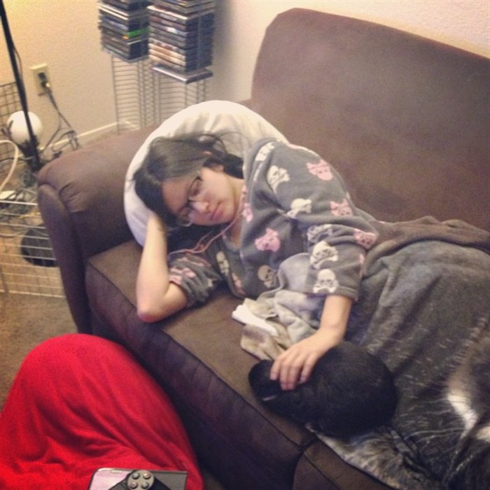 This is a rare picture of Koucha sitting on the couch and allowing me to pet her.