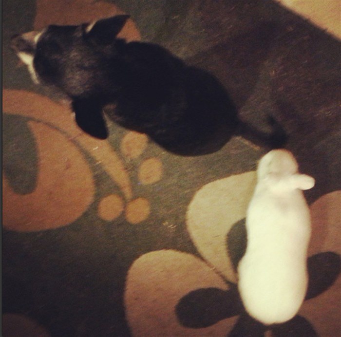 So far so good. Peter doesn’t get to really play with her for a couple months until she’s spayed and de-hormoned… but Zoey has gotten to sniff her and watch her through the gate. This has been the result of her watching the bunny play, and then laying down for a nap: