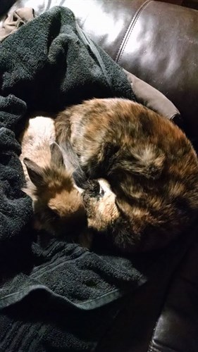 It’s been awhile since I’ve been here, but when there’s a new addition you just have to share! I posted in the behavior section about this, but to sum up, Cooper lost his mate, Penny, and their bond was so tight that the grief was causing him to rapidly lose weight (along with major anti-social behavior). The weight drop was so fast and severe we didn’t feel like we could just give him time to grieve and get back to normal. We brought home Chester the helicopter bunny and immediately they were buddies. So here they are a week later, best friends and Cooper is completely back to normal!