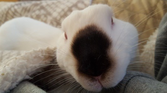 Up till now (only had him 4 months!!) he has been a light sandy colour all over, no black at all…. but he is going through a face mask moult and his face and head are turning French lop charcoal-y colour.