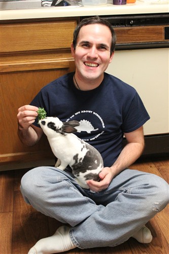 You know those books with pictures of men doing chores? (“Give the fairer sex what they really want- beautiful PG photos of hunky men cooking, listening, asking for directions, accompanied by steamy captions: “I love a clean house!” or “As long as I have two legs to walk on, you’ll never take out the trash.”) I wish there was a book with pictures of guys holding and hanging out with rabbits hahaha