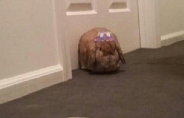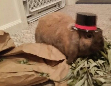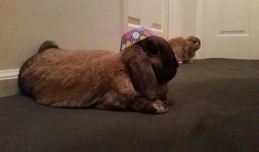 Jersey, she was being a major diva! She started thumping when she saw hubby with the camera, then thump, thump, thump when I put the hat on Moshi. You can see she wasn’t pleased with her cupcake hat either. Got the bunny butt all the way to salad time!